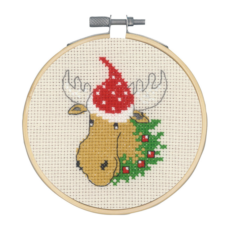 Broderikit indeholder nål, tråd, stof, ramme og mønster.
