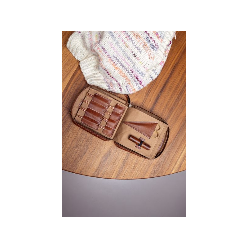 Meget lækker læder etui, med plads til både dine pinde og tilbehør. Et uundværligt etui til strikkeren.